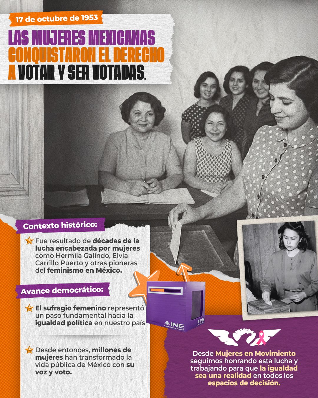 Gracias a la lucha incansable de mujeres valientes hoy tenemos voz, voto y representación. Desde #MujeresEnMovimiento, seguimos honrando su legado y construyendo un México donde la igualdad sea una realidad en todos los espacios de decisión.