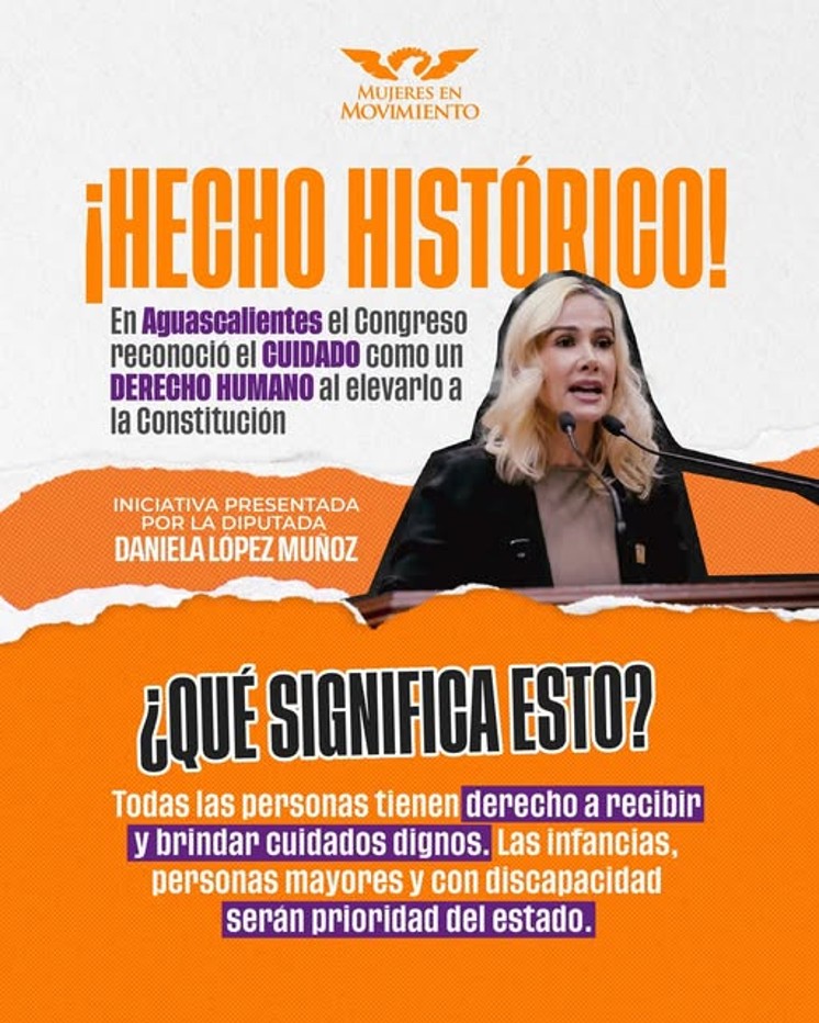 Desde Mujeres en Movimiento reconocemos el trabajo de la Diputada Dany López porque el día de ayer en Aguascalientes se aprobó su iniciativa de elevar a rango constitucional el DERECHO al CUIDADO.